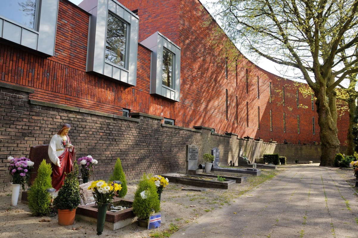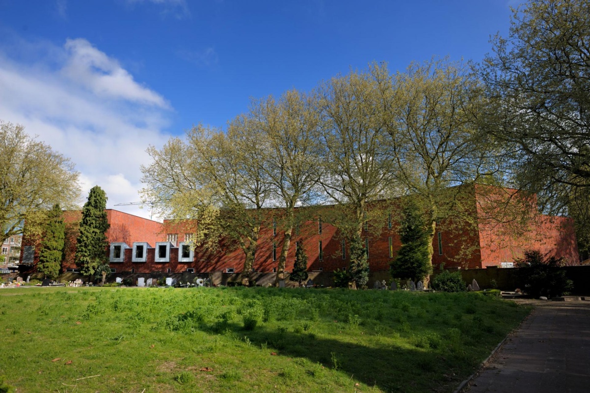 Op een kruispunt met aan 2 zijden een drukke verkeersweg en aan de achterzijde een begraafplaats op nog geen 1 meter van de gevel en midden op het bouwterrein 2 grote plantanen is de lokatie met recht bijzonder.