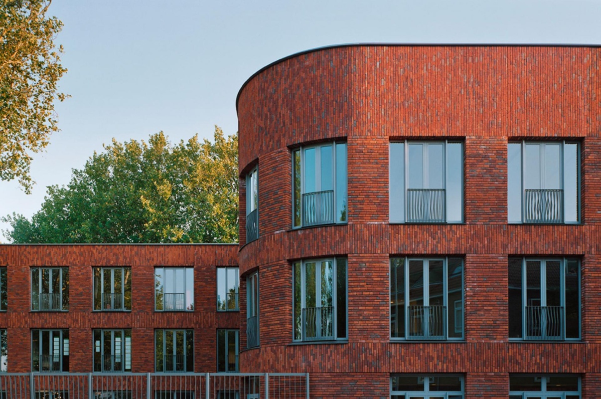 Buiten de lokatie zijn ook de gebruikte materialen die project doen uitblinken. Het casco is geheel in eigen beheer opgetrokken uit schoonwerk prefab beton en bevat diverse rondingen. De buitengevel is gemaakt van een ruwe handvormsteen welke in 2 formaten stootvoegloos vermetseld is, zowel horizontaal als grote vlakken verticaal. Gedeeltelijk zijn de stenen, verzaagd tot strips, gevat in betonnen L-elementen welke gestapeld op in het werk gemetselde penanten zorgen dat de zeer diepe neggen er uit zien als geheel vermetseld.